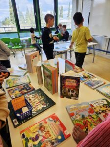 Passend zum Welttag des Buches am 23. April fand wieder die große Buchaustellung mit vielen neuen Kinderbüchern in der Lernwerkstatt der Arnoldus-Grundschule statt. Alle Schülerinnen und Schüler durften ausgiebig in den von der Gemeindebücherei Gilching bereitgestellten Büchern schmökern. Anschließend verteilten die Kinder auf einer Liste Punkte für ihr Lieblingsbuch. Die Bücher mit den meisten Punkten werden für die Schulbücherei angeschafft!