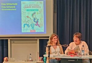 Frau Witterhold und Frau Schwenk aus der Gemeindebücherei lasen und das Buch „Ich und meine Chaos-Brüder – Band 1: Alarmstufe Umzug“ vor, ein humorvolles Kinderbuch, über die drei Brüder Ben, Bela und Henry, die ihre Familie bei der Wohnungssuche unterstützen.